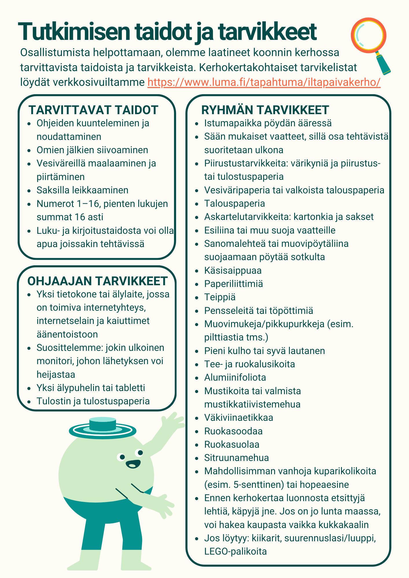 - Sään mukaiset vaatteet, sillä osa tehtävistä suoritetaan ulkona